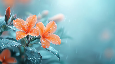 A captivating close-up of vibrant orange flowers adorned with raindrops, set against lush green leaves. This serene garden scene evokes a sense of tranquility and beauty in nature.