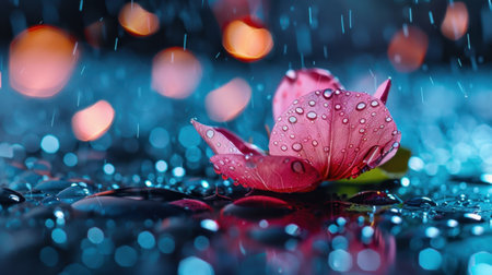 A stunning close-up of a pink flower petal covered in raindrops, resting on a shiny surface with soft, blurred lights creating a dreamy atmosphere.