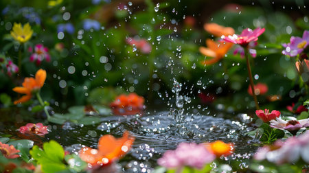 A captivating close-up of vibrant flowers resting on a serene water surface, enhanced by gentle splashes and droplets reflecting natural beauty and tranquility.