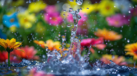 colored water jet in a garden full of flowers, taking advantage of the natural colors of the environment. generative ai