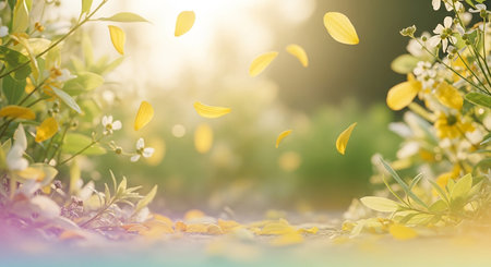 Dreamy showing soft focus meadow path with yellow flower petals falling gently in the warm sunlight creating a dreamy and serene atmosphere with...