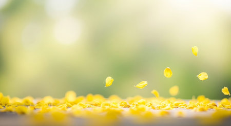 Delicate yellow flower petals are captured mid-fall onto a wooden surface, with a soft, blurred green bokeh background creating a serene and airy...