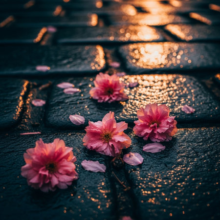 Raindrops cling to colorful petals scattered on a wet surface, reflecting warm sunlight during golden hour. The natural beauty highlights the vibrant colors and freshness after the rain.