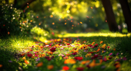 Colorful petals blanket the ground as sunlight sets in a serene outdoor setting