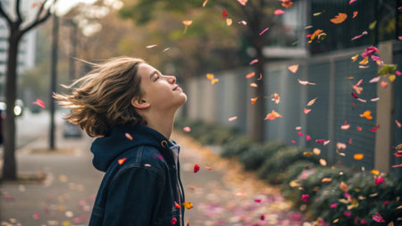 Cityscape Blossoms: Delicate Petals Dance on the Wind, Creating a Serene and Magical Scene