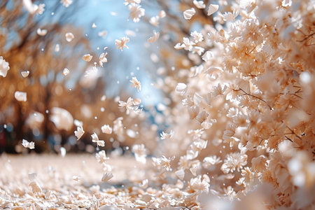Delicate and bright flowers fall gracefully from the sky. beauty and wonder of nature. Petals gently fall in the air. Sense of freedom and natural beauty. Generative AI