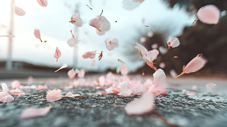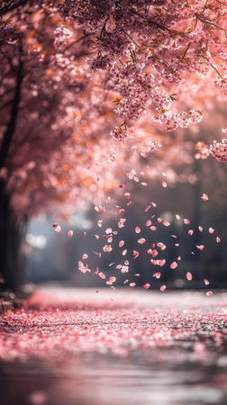 A serene scene of cherry blossom petals gently falling onto a city street, creating a vibrant pink carpet. The blurred trees in the background enhance the beauty of springtime.