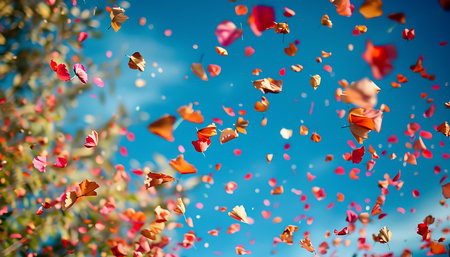 Falling red and orange petals on blue sky background