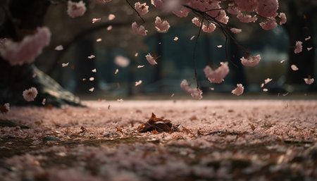 A captivating scene featuring soft pink cherry blossom petals gracefully falling to the ground, embodying the beauty and tranquility of spring in nature.