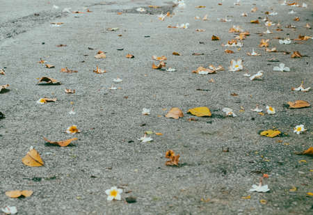 Fallen flowers and leaves on the asphalt road