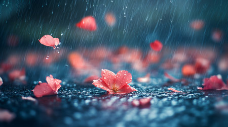 Cherry blossom petals and small leaves floating gracefully in the air, rain droplets creating a dreamy effect, springtime warmth, generative ai