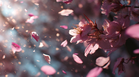 A captivating scene featuring cherry blossom petals gracefully floating through the air, embodying the essence of spring and peaceful beauty in nature.