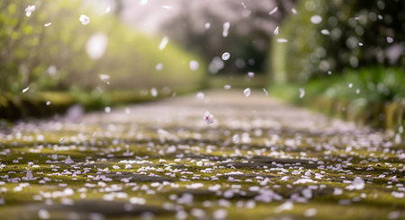A tranquil spring pathway adorned with delicate cherry blossom petals drifting in the breeze, bathed in soft golden hour light, capturing nature's beauty.