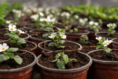 Many blooming flowers growing in pots with soil, closeup