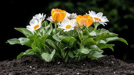 Flower bed with tulips and daisies on black background