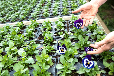 Close-up of a woman planting flowers in a greenhouse