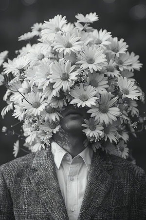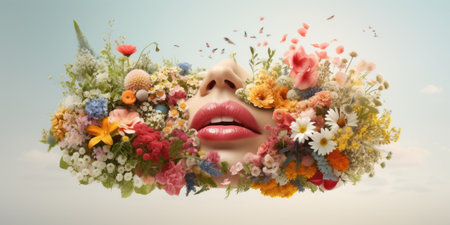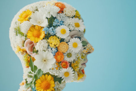 A creative portrait of a human head made of colorful flowers, embodying a harmonious blend of nature and art, representing beauty, growth, and freshness