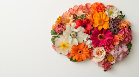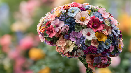 A surreal artwork of a human brain created entirely from colorful flowers, blending anatomy with vibrant garden blooms in a symbolic and artistic way.