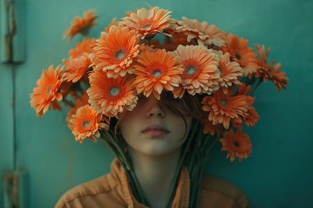 Close-up of a young woman's face partially obscured by vibrant flowers, conveying a sense of beauty and nature. Enchanting Floral Gaze. lush summer floral arrangement, captivating gaze. AIG50