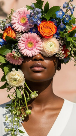 Artistic Close-up Portrait of a Black Woman with a Vibrant Floral Arrangement Covering Her Eyes, Creative Botanical Concept