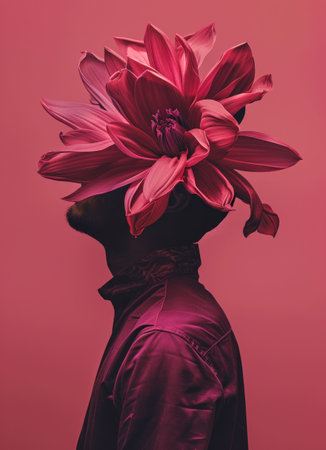 A silhouette of a person with a large pink flower on their head against a vibrant pink background