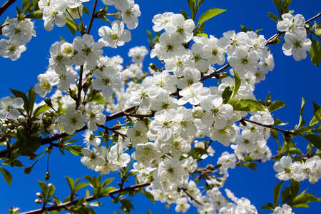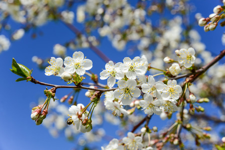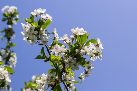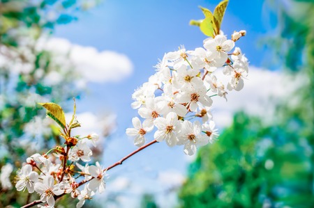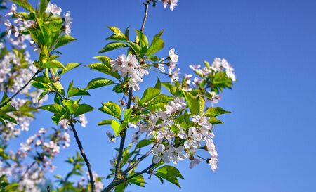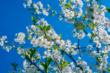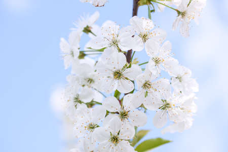 Spring background with white cherry blossom. Beautiful floral spring natural background. Branche of blossoming cherry tree close-up on blue sky background.