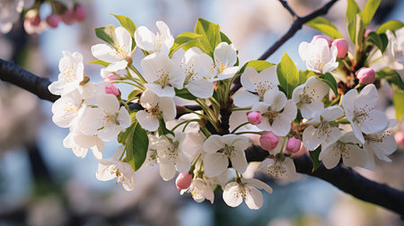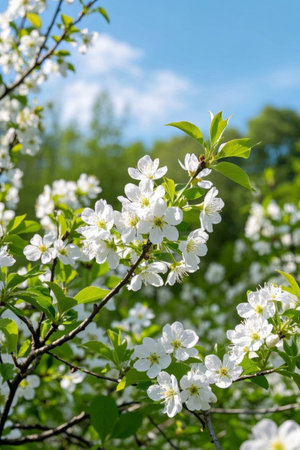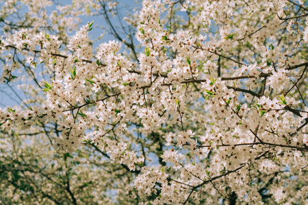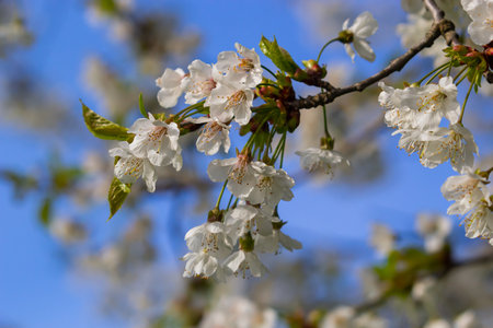Cherry blossom branch with delicate white flowers and fresh green leaves against a clear blue sky. Spring nature, floral beauty, and seasonal freshness in outdoor landscape.