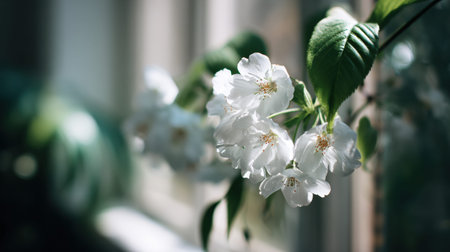 White flowers bloom with natural light shining through, bringing a fresh look to the indoor space and inviting a sense of renewal and energy.