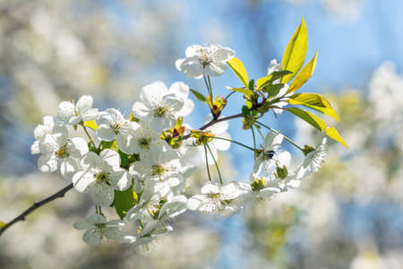 White cherry tree flowers close-up. Soft focus. Spring gentle blurred background. Blooming apricot blossom branch. Beginning of season, awakening of nature. Fresh green leaves.