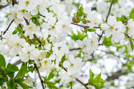 Blooming cherry branches with white flowers close-up, background of spring nature. Macro image of vegetation, close-up with depth of field.