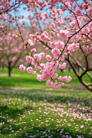 Blooming pink cherry orchard. Cherry blossoms. AI generated.