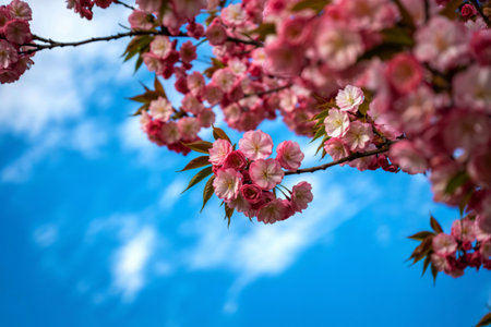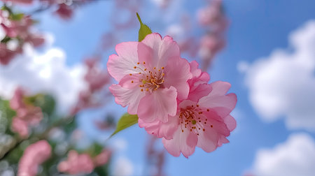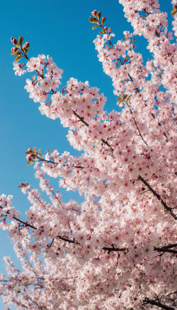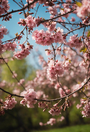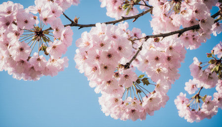 Delicate pink cherry blossoms bloom against a bright blue sky, creating a tranquil and vibrant scene that embodies the beauty of springtime nature.