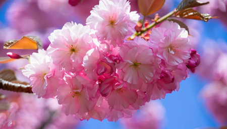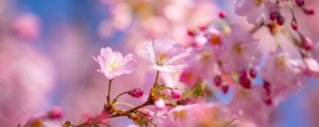 blossoming branch with bloom pink flower buds of cherry or sakura tree on blue sky background, horizontal outdoors stock macro photo image wallpaper