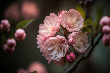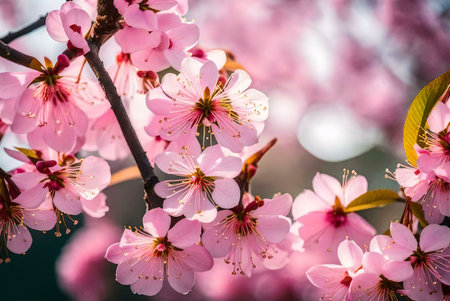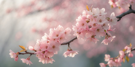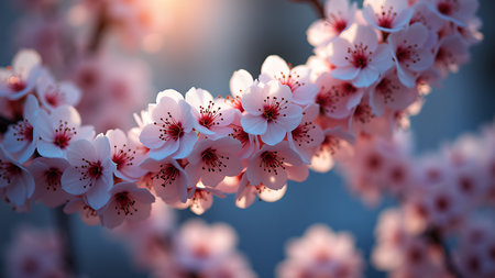 A close-up shot showcases the delicate beauty of cherry blossoms in full bloom, their soft pink petals illuminated against a blurred, atmospheric backdrop.