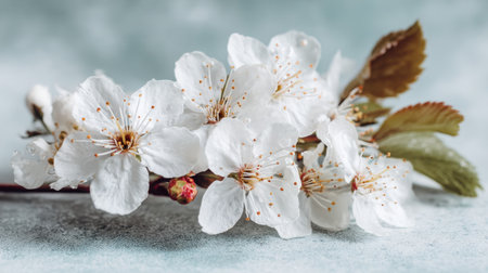 A beautiful branch of white cherry blossoms featuring delicate petals set against a soft blue background, perfect for spring-themed designs.