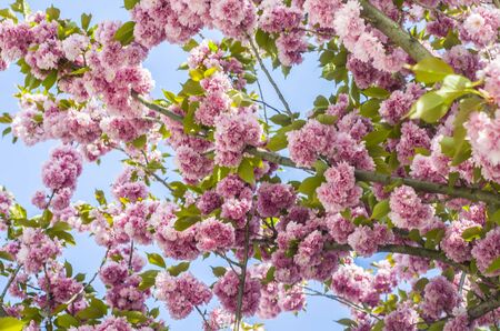 Pink violet flowers of cherry blossom on cherry tree close up. Blossoming petals of cherry flower. Nature. Bright floral scene with natural lighting. Spring concept Wallpaper background for greeting card. copy space