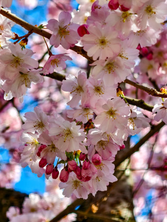 Beautiful close up of cherry sakura tree in spring bloom time over bright blue sky. Spring floral vertical background.
