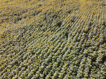 This beautiful aerial view showcases a vibrant field of marigold flowers in bright yellow, set against lush green foliage.