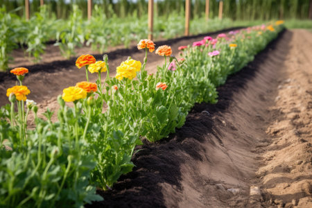 row of freshly planted flowers, ready to blossom and bloom, created with generative ai