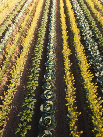 Cabbage plants in rows in a farm field, aerial view from drone.