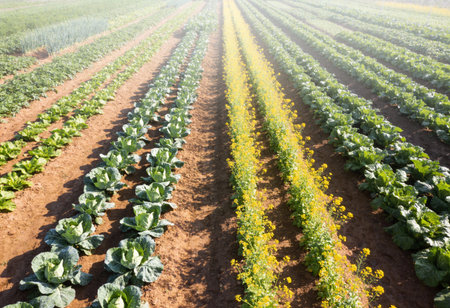 Cabbage field in the morning light. Agricultural landscape with rows of cabbage plants
