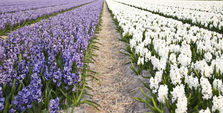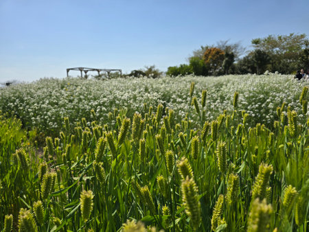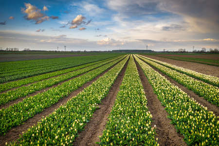 A breathtaking view of lush green fields featuring symmetrical rows filled with vibrant flowers. This agricultural landscape showcases nature's beauty and tranquility.
