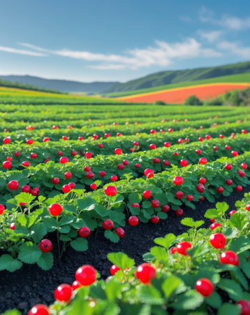 AI Generated. Panoramic view of vibrant colorful fields with organized rows of currant bush seedlings in a lush agricultural landscape