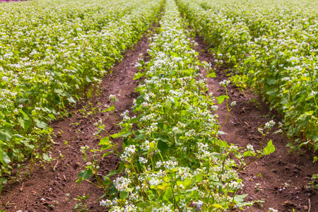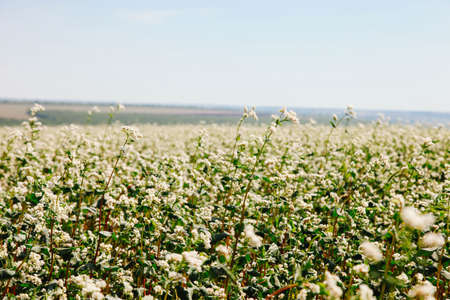 A field of buckwheat blossoms against the blue sky. Agriculture, landscape.
