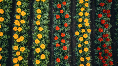 Aerial view of vibrant flower rows interspersed with green plants in a serene garden. The colorful blooms create a striking pattern against the earthy soil.