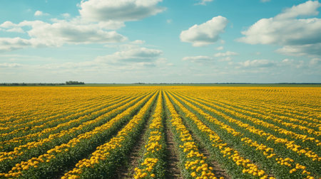 A breathtaking view of a vibrant yellow flower field stretching under a clear blue sky adorned with soft, wispy clouds, capturing the essence of nature.