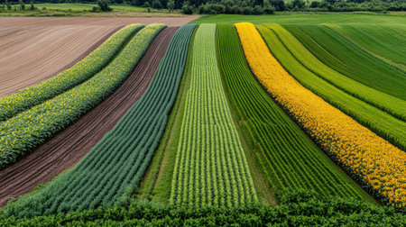 A Vibrant fields of crops and sunflowers create colorful landscape