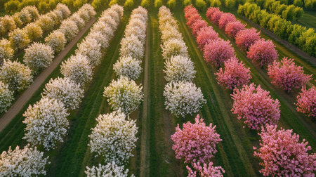 Aerial view of an orchard in full bloom, with rows of fruit trees displaying a sea of white and pink blossoms.
