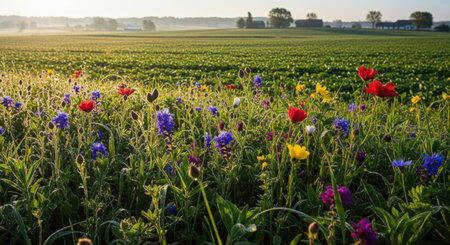 Wildflowers and cornflowers growing on an agricultural field at sunset