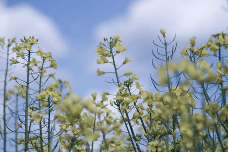 Flowering rapeseed with blue sky and clouds. Blooming canola field, close-up.